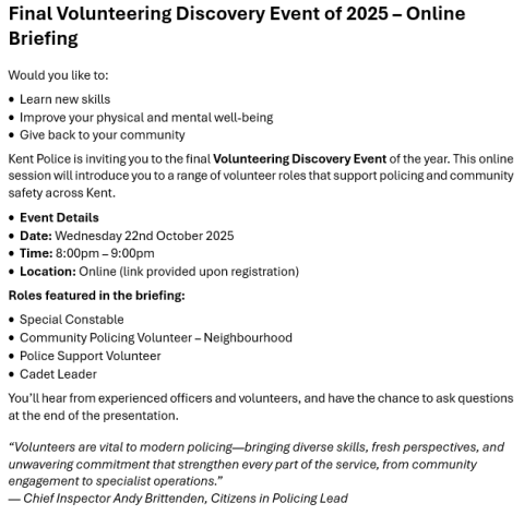 To register – log online at https://www.kent.police.uk/ and type Volunteering Discovery Event in the search engine to access the registration gateway