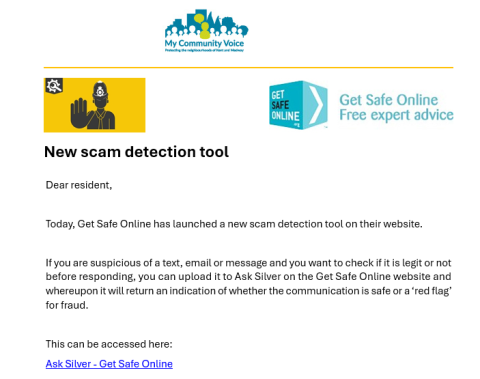 My Community Voice – New Scam Detection Tool Published on October 10, 2025 To access information online go to: https://www.getsafeonline.org/asksilver/